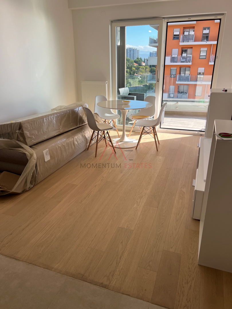 Si affitta un appartamento moderno in una nuova costruzione a Kantrida, di superficie 50 m2.. L'appartamento è composto da: un ampio soggiorno collegato con la cucina e la sala da pranzo, una camera da letto, un bagno, un corridoio, un loggiato con una splendida vista sul mare. L'accesso al loggiato è disponibile dal soggiorno e dalla camera da letto.