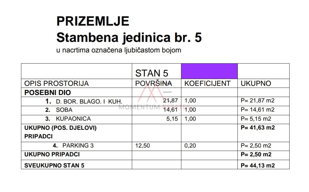In vendita appartamento in un piccolo edificio con 12 appartamenti. L’appartamento si trova al piano terra, ma a causa della configurazione del terreno è al livello del primo piano. È composto da soggiorno con sala da pranzo e cucina, una camera e un bagno, con una superficie utile di 41,63 m2. All’appartamento è assegnato un posto auto di proprietà esclusiva. All’appartamento appartiene anche una parte di giardino esterno. L’edificio è nella fase finale di ristrutturazione e durante i lavori l’appartamento è stato completamente ristrutturato, utilizzando materiali moderni.